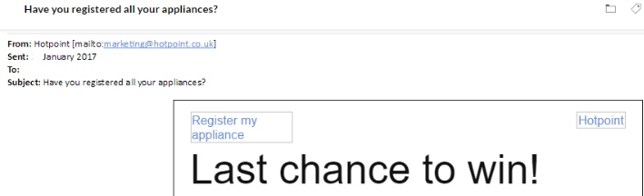 Manufacturers are already using your data to sell warranties and communicate with you when you sign up to their UNSAFE Appliance Register. The image here shows a very recent email from their register, used for marketing purposes. We were told by the UK Government BEIS department that they would not conduct such activity, but we fear a certain naivety is prevalent in that department.